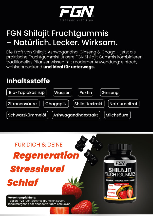 Die Kraft von Shilajit, Ashwagandha, Ginseng & Chaga – jetzt als praktische Fruchtgummis! Unsere FGN Shilajit Gummis kombinieren traditionelles Pflanzenwissen mit moderner Anwendung: einfach, wohlschmeckend und ideal für unterwegs.